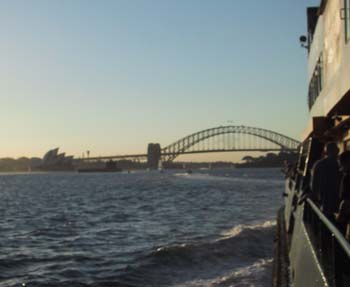 Die Harbour Bridge im Sonnenuntergang vom Schiff aus. Leider ein wenig unscharf das Bild...
