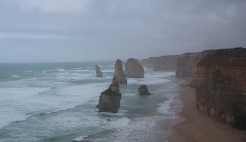 Leider wollte es das Wetter an diesem Tag nicht so. Vom Sturm bis Sonnenschein hat es sich abgewechselt. Daher leider nur dieses verstürmte Bild. Diese Fels-Stöpsel nennen sich die 12 Apostel. Auf dem Bild sind es knapp die eine Hälfte.