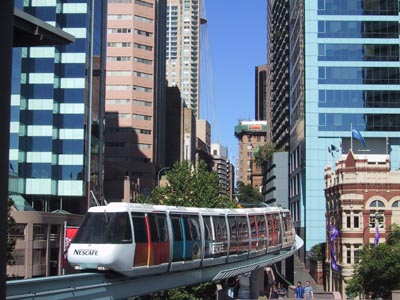 Die Monorail fährt in Downtown Sydney einen Kreis um Darling Harbour. Man beachte die schönen Farben und den Kontrast.