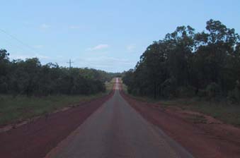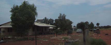Auf dem Weg zum Kings Canyon trafen wir ein Auto voller Aborigines (1 Erwachsener plus ca. 5 Kinder), welche eine Panne hatten. (Kein Wasser, kein Motorenöl, kein Benzin mehr). In einem weiteren Fahrzeug daher kam eine Frau, die die Aboriniges gut kannte und uns anwies, in die 'Community' zu fahren und die Verwandten um Hilfe zu bitten. Es handelte sich um David Namajira, den Sohn des bekannten Aquarell Malers. Aha. Nachdem wir ca. 5 Liter Wasser ihnen überlassen hatten, machten wir uns auf den Weg in diese Community. Siehe Bild. Man sollte die Unordnung erkennen: Alte Autos, Müll, etc. liegen herum...