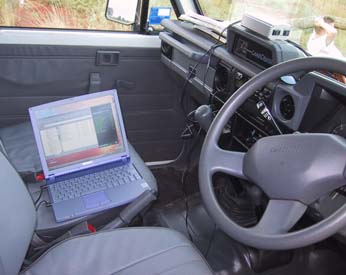 Im Outback hat es leider nicht soviel Radio Unterhaltung, daher muss man den ultra-portablen MP3 Player (Sony Vaio Notebook) auspacken und anschliessen. (das silbrige Kästchen ist der 12V-100V DC-AC Wandler gekauft in Tokyo plus die Wandler-Kassette, welche die Signale vom 3.5mm Sound Output Port in an den Tonkopf im Tape-Deck überträgt)