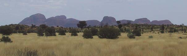 Diese weniger bekannten Steinformationen sind die Olgas. Sie stehen ca. 30 km weiter westlich vom Uluru und bestehen wohl aus demselben Material wie der Uluru. Es sind insgesamt 36 einzelne Felskuppen.